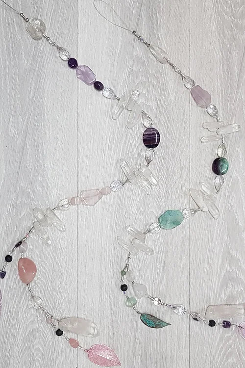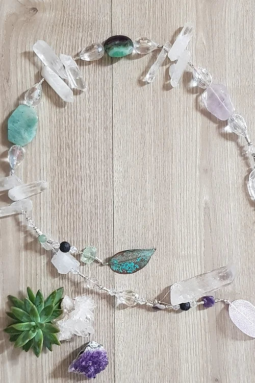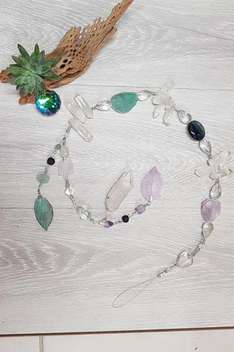 Gorgeous chunky crystal hanger incorporating stunning natural stones such as Fluorite, Amozonite, Amethyst, Quartz crystals points, a real leaf that has been electroplated, lava beads to drop your favourite essential oils onto & top-quality glass jewels.