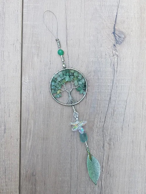 Genuine Aventurine Tree of life hanger incorporating gorgeous natural stones & top-quality glass jewel beads & a real painted leaf that have been electroplated. Approx length 25cm, tree of life width 5cm.