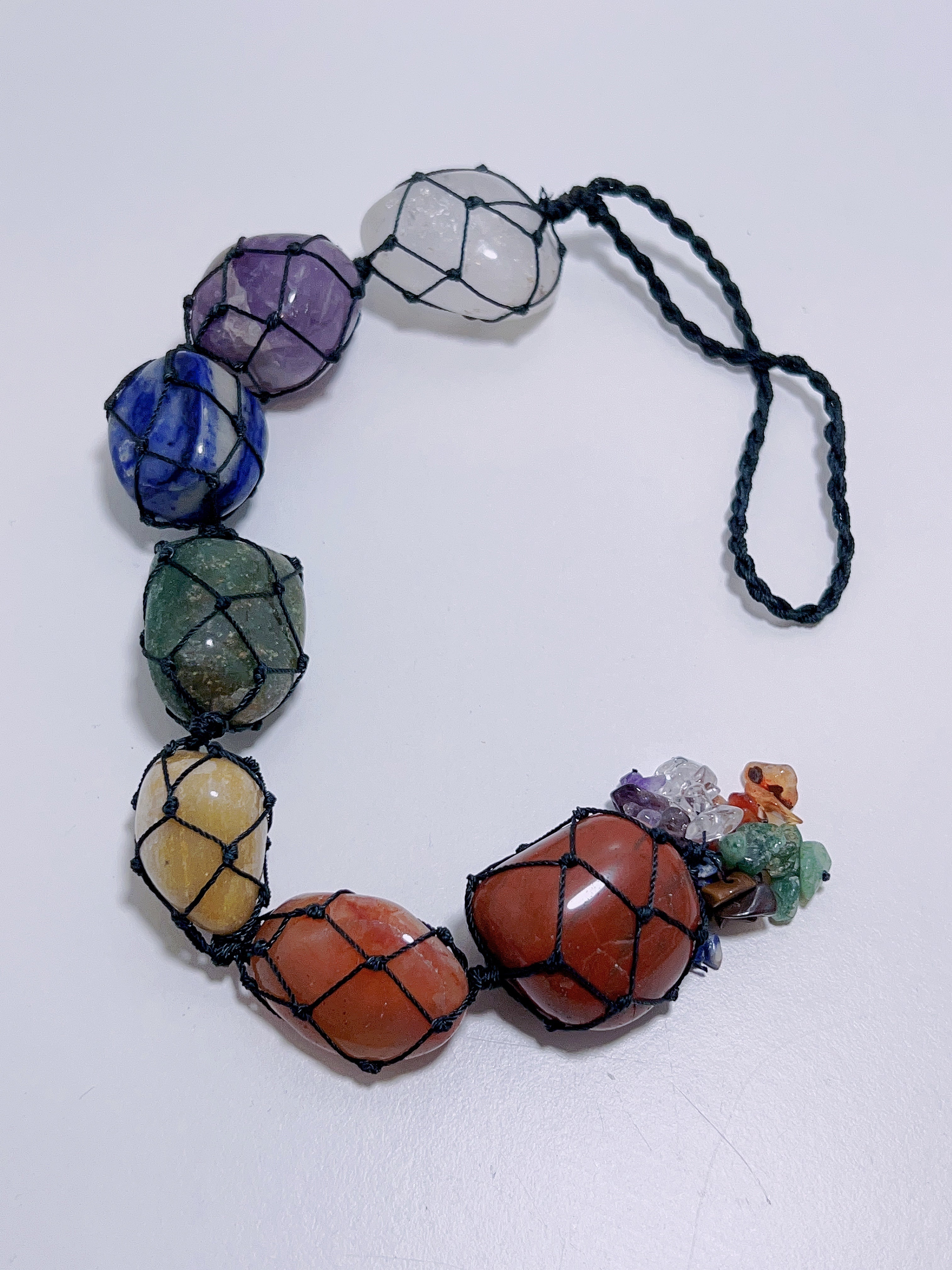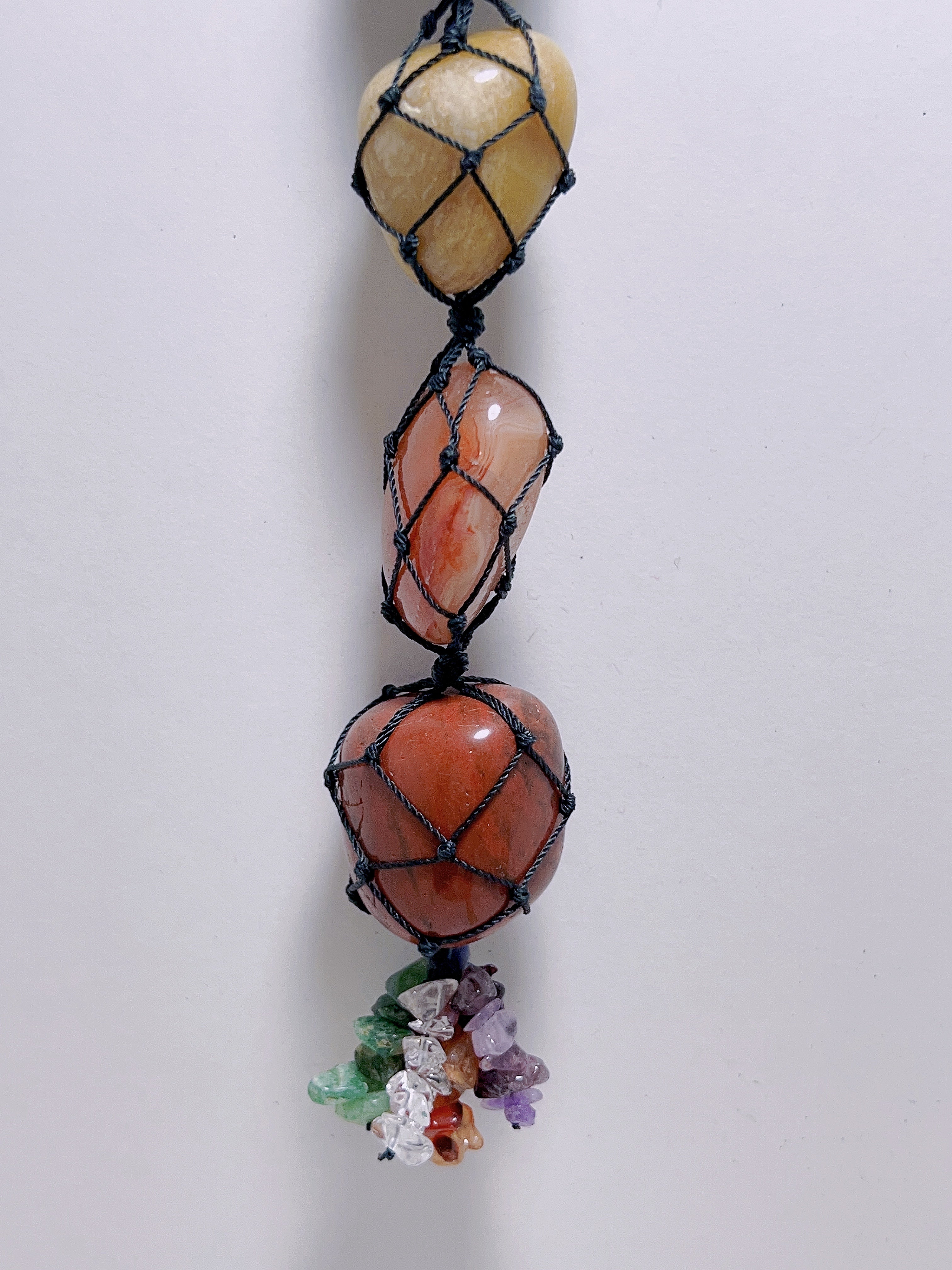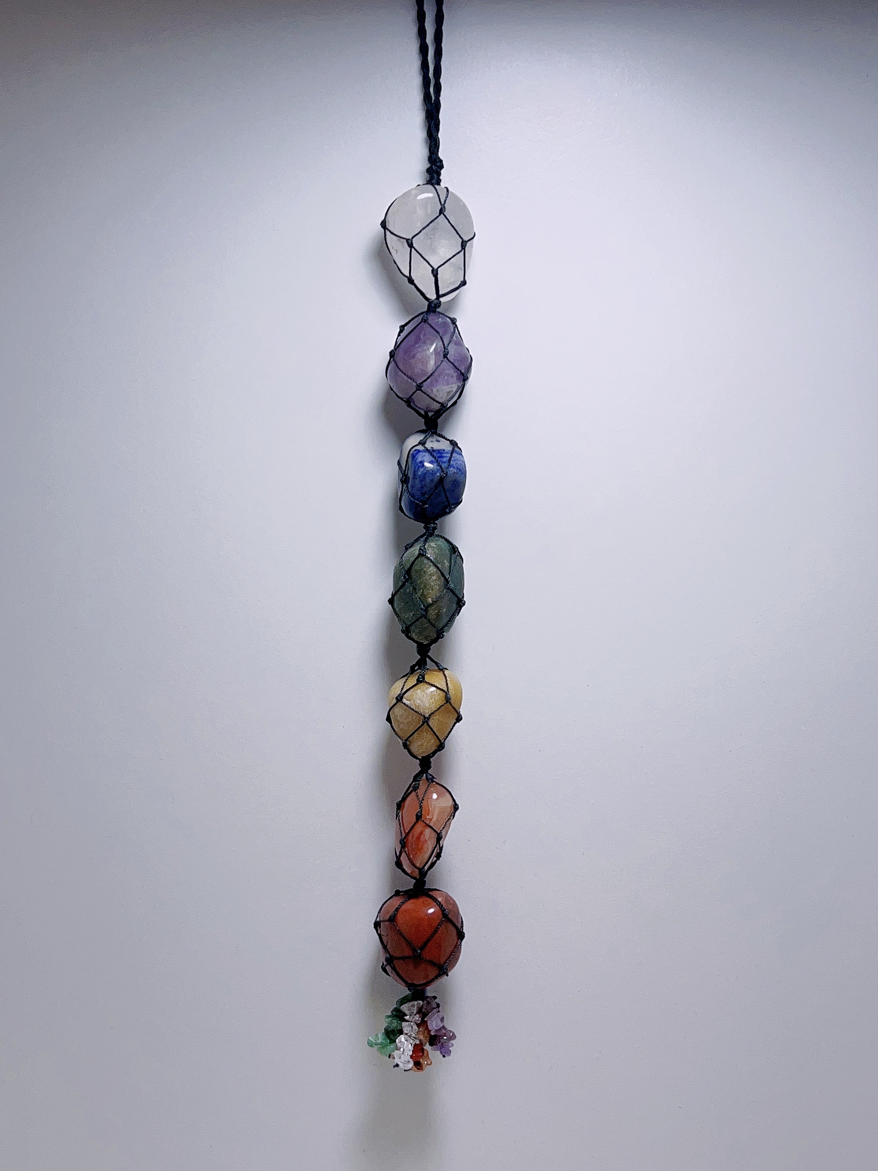 These beautiful 7 chakra tumbles woven into a hanger for your personal needs . Great for meditation. Great for your room or office space . App