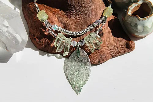 Made with quality natural stones including Prehnite, Quartz crystals, & an electroplated real leaf.