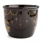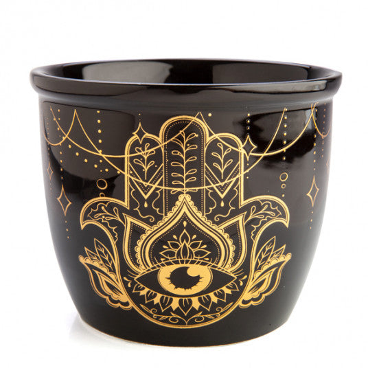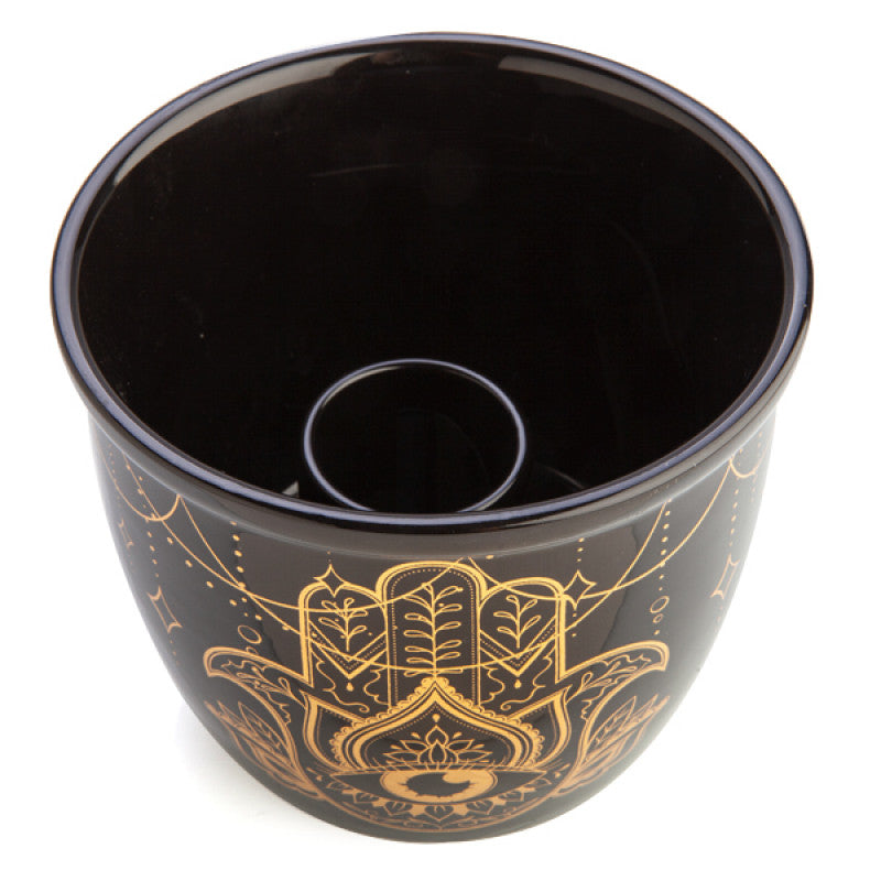 • Intricate gold foil hamsa design on a jet black bowl