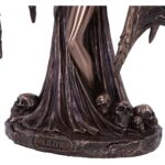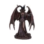 Lilith The First Woman, a symbol of female power. Many feminists see Lilith not only as the first woman but the first independent woman, however, some stories also portray Lilith as a demoness. She is dressed in a long flowing gown and wears a horned mask on her head which covers her eyes. A snake rests in her left hand and wraps itself over her arm and around the back of her hips, whilst she gazes into its eyes. Wings dominate her back, which also shows that there is a dark aura surrounding her. Cast in the finest resin before being expertly finished in bronze, this figurine will sure be a standout in any display.