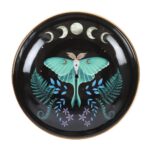 Practical and stylish, this gorgeous incense plate features an enchanting luna moth and moon phases design. The plate is thoughtfully designed to accommodate both incense sticks and cones, featuring a small hole in the center for sticks and a flat, stable surface suitable for burning cones. Part of the Dark Forest range of mystical woodland gifts and home decor. H2cm x W9cm x D9cm
