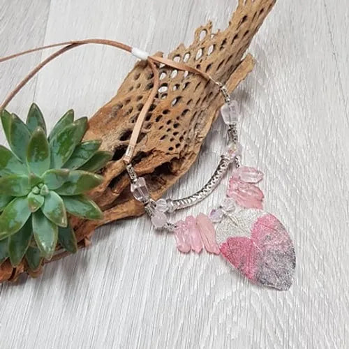 Made with an electroplated real leaf painted, quality natural stones including Rose Quartz beads, Clear Quartz & crystal points.