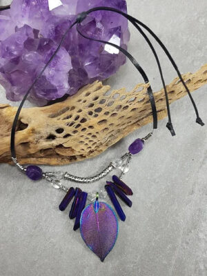 Purple Iridescent Leaf / Amethyst / Clear Quartz Crystal Necklace $49.99