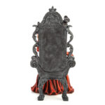 • Figurine of a stunning red-haired queen sits on her intricately carved throne
