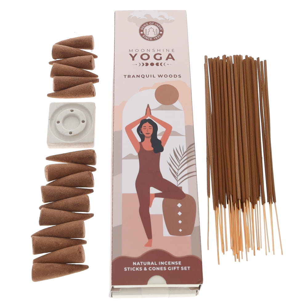Tranquil Woods Moonshine Yoga Incense Gift Set with 40 Sticks, 16 Cones and Ceramic Holder