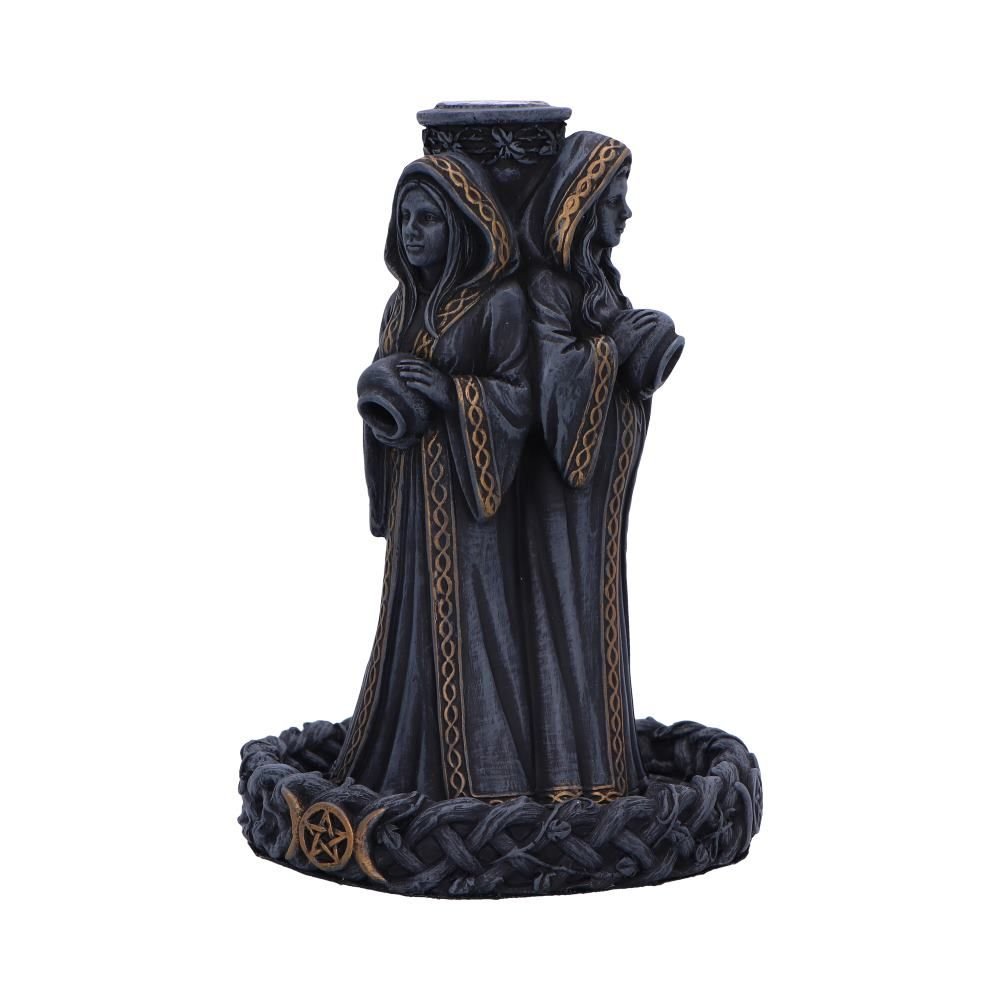 Embrace the sacred cycles of life with our Triple Moon Goddess Backflow Incense Burner from Nemesis Now’s premium collection. Crafted from high-quality resin and painted in elegant black with intricate gold detailing, this burner depicts the symbols of maiden, mother, and crone encircling a central pillar. Atop the pillar, an incense cone delicately releases fragrant smoke, descending from pots held by each of the symbolic women. The smoke gracefully pools in a wreath of Celtic knots beneath them, creating a mesmerizing visual display. This backflow incense burner is a tribute to the ancient wisdom of the triple goddess and the interconnectedness of life’s phases. As part of our extensive collection, it’s perfect for those who seek to infuse their space with the magic and symbolism of the mother, maiden, crone. Explore our wide range of mother, maiden, crone, Wiccan, and witchcraft-themed giftware, each piece crafted to enhance your spiritual journey and connection to the divine feminine.
